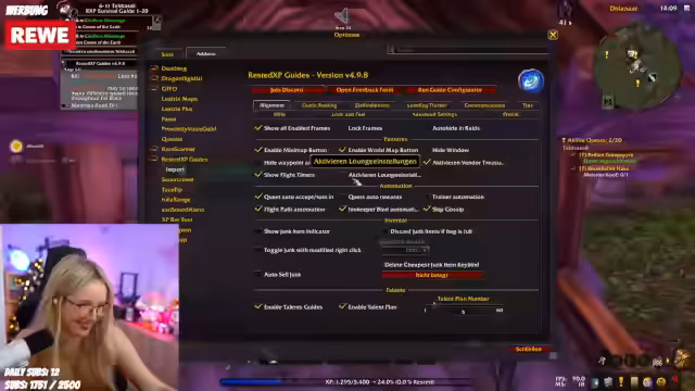 06:32:43Der Streamer diskutiert seine Erfahrungen mit dem RestedXP-Add-On, das ihn durch das World of Warcraft-Abenteuer führt. Obwohl er einigemetzliche Fortschritte macht, stellt er fest, dass das Addon in vollen Dungeon-Instanzen nicht berücksichtigt, wie viele andere Spieler den Respawn verlangsamen. Dennoch scheint es ihm effiziente Wege zu einem höheren Level zu weisen. Der Streamer entscheidet sich bewusst, bis Level 30 zu leveln und überlegt, wie er die erneute Erreichung dieses Levels am schnellsten schaffen kann.