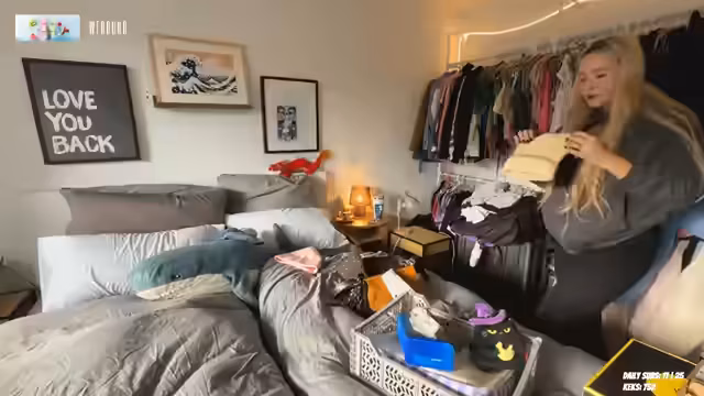 03:09:01Die Streamerin freut sich auf die gemütlichere Gestaltung ihres Schlafzimmers, wobei sie über die Notwendigkeit eines Vorhangs nachdenkt. Sie ist optimistisch, dass ihr neues Nachttischchen für mehr Ordnung sorgen wird, da sie dort Bücher und andere Gegenstände verstauen kann, die derzeit unter ihrem Bett liegen. Sie zeigt ihre Begeisterung für die Farbe des neuen Nachttischchens und hofft, dass es gut zu einem zukünftigen gemütlichen Teppich und einer schönen Bettwäsche passt. Die Streamerin möchte ihr Schlafzimmer insgesamt wärmer gestalten, da sie es derzeit als zu kühl empfindet. Sie erwähnt auch ihre Schwierigkeiten, Kleidung zu organisieren und zu tragen, bevor sie verstaubt. Sie zeigt ihre neuen Emma-Kissen und den Topper, die Teil ihrer Kooperation sind, und fragt ihre Zuschauer nach Vorschlägen für die Farbe ihrer neuen Bettwäsche, die zu ihrem cremefarbenen Bett passen soll. Dunkles Waldgrün ist dabei ihr persönlicher Favorit.