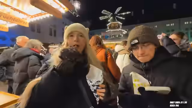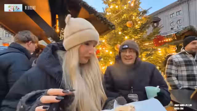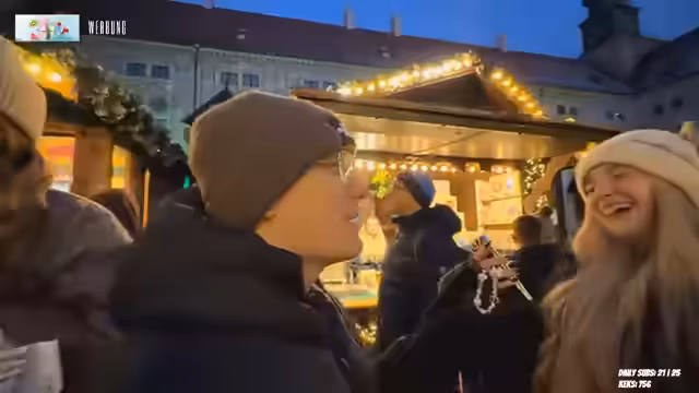 06:53:38Die Suche nach Schokofrüchten und einer Schoko-Chili geht weiter, wobei die Erwartung besteht, dass die Schoko-Chili nicht besonders scharf sein wird. Die allgemeine Atmosphäre des Weihnachtsmarktes wird weiterhin als sehr belebt beschrieben, aber es werden auch ruhigere Bereiche gefunden. Es wird über die bevorstehende Einziehung zum Wehrdienst gesprochen, wobei aufgrund der Stream-Awards und des Weihnachtshauses eine Verschiebung möglich ist. Die Vorweihnachtszeit wird als angenehm empfunden, obwohl die Kälte als störend empfunden wird und der Sommer als bevorzugte Jahreszeit gilt. Es wird über die Vorteile des Sommers wie kurze Hosen, Baden und abendliche Spaziergänge gesprochen. Ein Kinderpunsch wird als 'solide' bewertet. Die Diskussion über das Älterwerden und die Bedeutung, 'jung geblieben' zu sein, wird fortgesetzt, wobei die Rolle des Internets und des Zeitgeistes betont wird. Die Idee einer 'Gothic-Geburtstagsfeier' zur Beerdigung der 20er Jahre wird als kreativer Plan für den 30. Geburtstag geteilt.