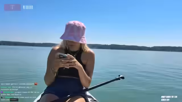 03:15:33Die Streamerin ist am Wörthsee zum Stand-up-Paddeln und berichtet über das sommerliche Wetter mit 31 Grad und hoher UV-Warnung. Sie erwähnt, dass sie hier gestern war und das Internetproblem weiterhin besteht, was das Streamen erschwert. Während des Paddelns beobachtet sie Haubentaucher, die laut sind, aber als hübsch empfunden werden. Sie äußert ihre Freude, wieder braun zu werden, da sie in den letzten Wochen blass geworden ist. Die Internetverbindung ist jedoch so schlecht, dass sie nicht sieht, was die Zuschauer sehen, und die Vorschauen nicht laden können.