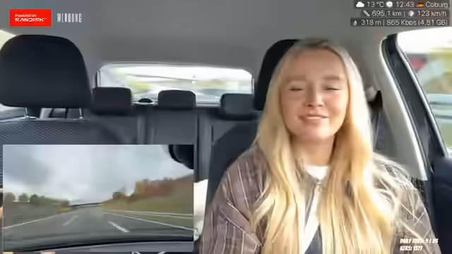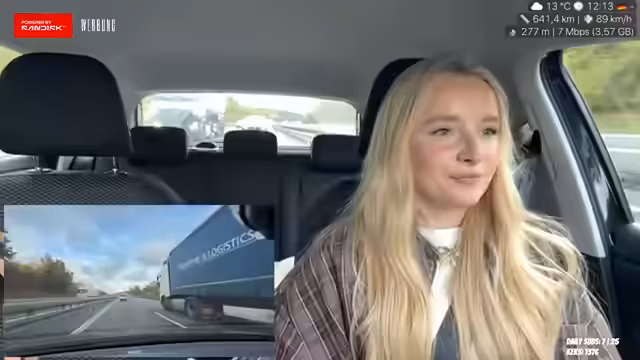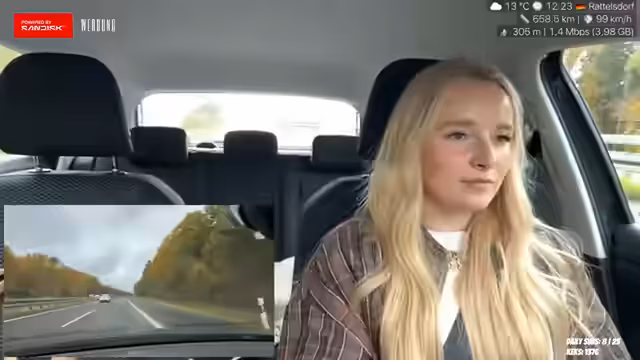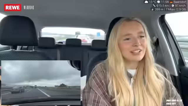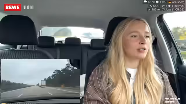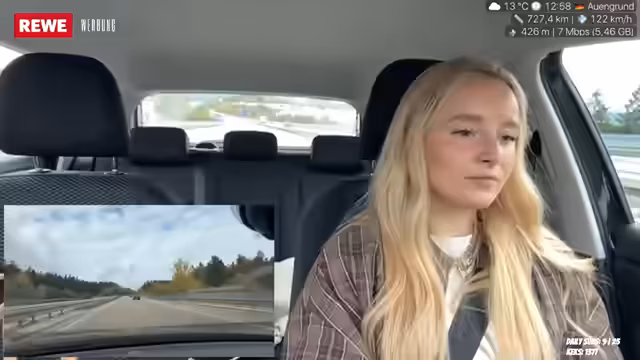 01:56:14Die Fahrt geht entspannt weiter, wobei die Streamerin einen Spicy Chicken Wrap isst, der als scharf, aber gut beschrieben wird. Sie bemerkt, dass deutsches Essen normalerweise nicht scharf ist und dass sie beim Essen beide Hände am Lenkrad hält. Die Reise ist bereits eine Stunde lang, fühlt sich aber länger an, da 280 Kilometer zurückgelegt werden müssen. Sie erwähnt, dass sie früher für ihr duales Studium regelmäßig drei Stunden nach Eisnach und zurückgefahren ist. Die Streamerin fährt konstant zwischen 100 und 120 km/h und hofft, dass das Essen ihr Energie gibt, da sie schlecht geschlafen hat. Sie äußert den Wunsch, bei Regen nicht zurückfahren zu müssen und bemerkt das Überholverhalten von LKWs auf der Autobahn, das sie als 'crazy' empfindet. Trotz des Nieselregens hofft sie auf eine baldige Aufklärung des Wetters.