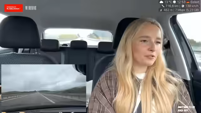 01:55:16Die Fahrt Richtung Heimat Eisenach beginnt, der Regen lässt nach. Der Streamer isst unterwegs Spicy Chicken Nuggets und trinkt Kaffee, was ihn aufgrund von Unterzuckerung in einen traumartigen Zustand versetzt. Die Musik wird als aufmunternd beschrieben, und es gibt eine kleine technische Verwirrung, weil das Chatfenster ausgeblendet ist, um ungestreamt zu bleiben. Der Fahrstil wird als entspannt mit einer Geschwindigkeit zwischen 100 und 120 km/h charakterisiert.