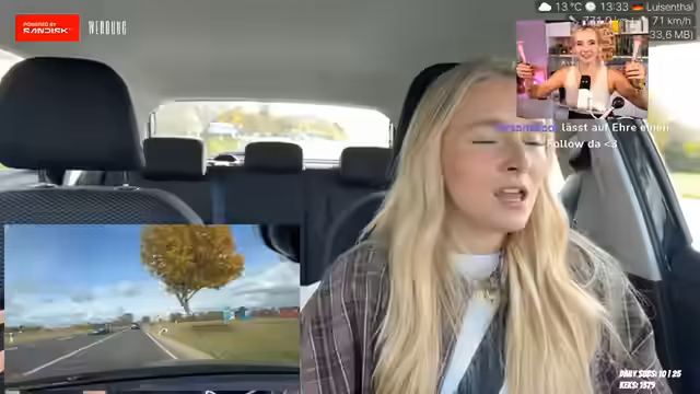02:16:48Die Streamerin fühlt sich durch einen zu schnell fahrenden LKW hinter sich gestresst und ärgert sich über einen Mittelspurschleicher. Sie plant, wahrscheinlich noch am selben Abend zurückzufahren, es sei denn, sie trödelt zu lange und muss in Thüringen übernachten. Die gegessenen Nuggets waren nicht mehr frisch und pappig, was sie an 'Rattenschlips' erinnert. Sie bemerkt, dass ihre Augen in letzter Zeit schlechter geworden sind und sie ohne Brille nicht einmal mehr den Twitch-Chat lesen kann. Dies führt zu Überlegungen, sich die Augen lasern zu lassen, da sie kurzsichtig ist und eine starke Hornhautverkrümmung hat. Das Autofahren bei Regen ohne gute Sicht ist für sie ein Problem, weshalb sie eventuell nicht nach Hause fährt. Ihre aktuelle Brille nervt sie, da sie ständig rutscht. Sie trägt Monatslinsen, die weich sind, hofft aber, dass sie diese gut verträgt.