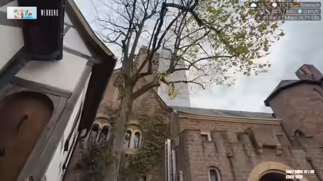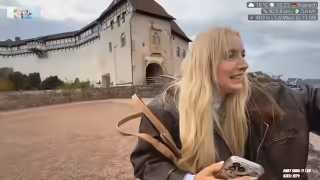 06:10:02Die Streamerin denkt beim Betreten von Burgen immer darüber nach, was dort alles erlebt wurde, und erinnert sich an die Reichsburg Cochem, wo sie für ein YouTube-Video mit "Geschichtsfenster" gedreht hat. Sie bietet an, ihre Zuschauer zum Weihnachtsmarkt auf der Wartburg mitzunehmen. Sie zeigt eine große Kanone, die auf die Stadt gerichtet war, und spekuliert, ob hier Märchenfilme gedreht wurden. Sie bestätigt, dass Filme gedreht wurden, darunter "Der Drachensaal". Sie zeigt das Burschenschaftsdenkmal, das sie als Teil der Eisenacher Geschichte erwähnt, aber nicht mehr alle Details kennt. Sie weiß, dass die Burschenschaften einmal im Jahr dorthin wandern. Sie erwähnt, dass es auf der Burg Abschlussfeste, Weihnachtsmärkte und Konzerte gibt, aber nicht viele Mittelalterfeste. Sie ist überrascht zu hören, dass Studentenverbindungen heutzutage oft umstritten sind. Sie erwähnt eine weitere Burg außerhalb von Eisenach, die Kreuzburg, die sie auch wieder besuchen möchte. Sie bemerkt die Windräder und den kleinen Flughafen mit Privatfliegern. Sie erinnert sich an eine Rennserie, die ihr bekannt vorkommt, und freut sich auf die Möglichkeit, die Essen Motorshow zu besuchen. Sie ist nervös, ihre Oma zu sehen, da sie Angst hat, das Altern ihrer Verwandten zu bemerken. Sie bemerkt, dass sie an manchen Orten direkt an ihre Zeit als Bestatterin denken muss, was sie als "weird" empfindet.