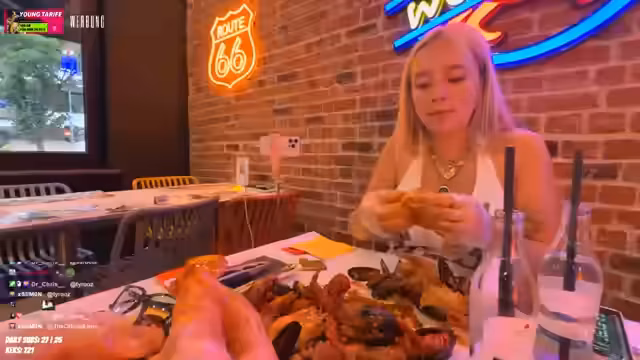 09:29:04Die Streamer erreichen das WowCrab-Restaurant und wählen eine Meeresfrüchte-Kombination für zwei Personen aus. Sie entscheiden sich für Langoustinen, Garnelen und Krebs, wobei sie die Würzung scharf mögen. Die Vorfreude ist groß, und die Atmosphäre ist aufgeregt. Während des Wartens auf das Essen wird über den Ablauf und das bevorstehende Essen gesprochen, wobei die Streamerin ihre Vorfreude durch Gesten und Ausrufe zum Ausdruck bringt.