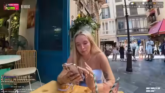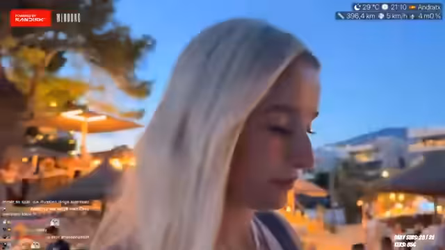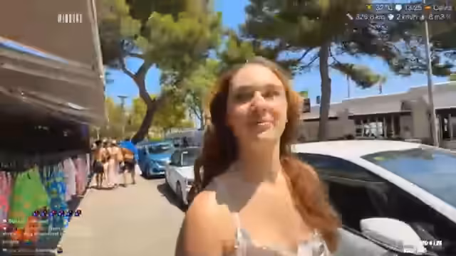 08:16:31Während der Fahrt zum Strand geht das Navigationsgerät der Streamerin kaputt. Da sie ohne Navi ist, muss sie sich auf die Anweisungen des Chats und ihrer eigene Orientierung verlassen. Es herrscht etwas Zeitdruck, da sie nur noch eineinhalb Zeit bis zum Sonnenuntergang hat, und sie sucht nach einem Parkplatz in einem als touristisch beschriebenen Ort.