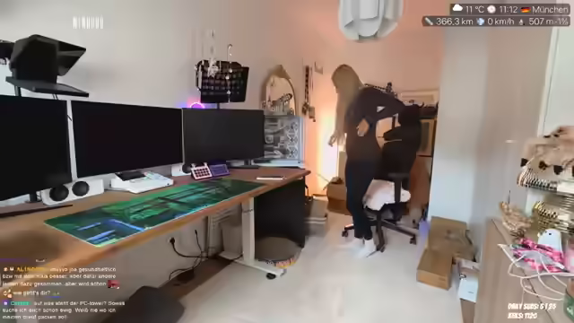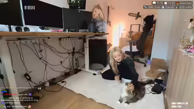 03:11:04Nachdem Kito wieder aus dem Raum gebracht wurde, um die Kabel zu schützen, stellt die Streamerin ihre zweite Katze vor, eine British Kurzhaar-Mix namens Geil. Diese ist ruhiger und knabbert nur gelegentlich an Kabeln. Anschließend widmet sich die Streamerin wieder dem Setup-Umbau. Sie plant, ihren Samsung Odyssey OLED G81SF Gaming-Monitor als Hauptmonitor zu verwenden und einen anderen Monitor für den Chat im Hochformat zu positionieren, um mehr Platz auf dem Schreibtisch zu schaffen. Sie erwähnt auch, dass sie einen massiven Monitorarm für ihren neuen Monitor erworben hat, um Stabilität und Flexibilität zu gewährleisten.
