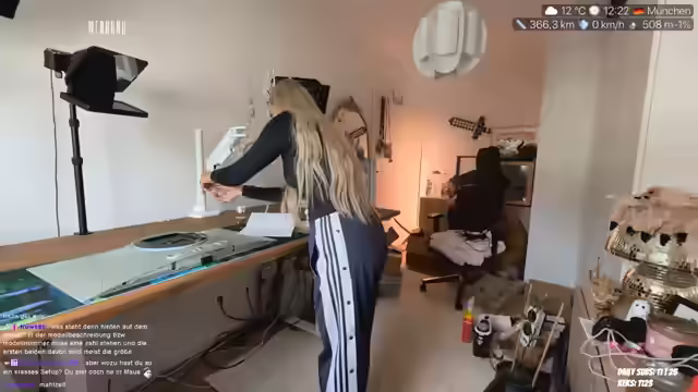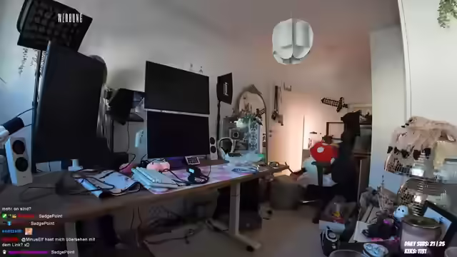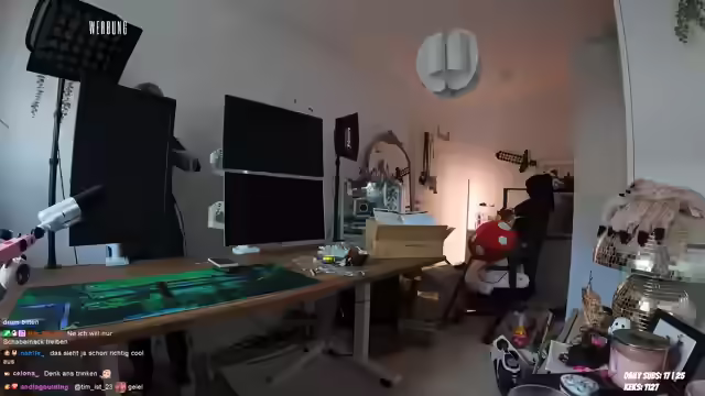 06:14:47Der Streamer überprüft den Chat und passt die Position der Kamera an, um eine optimale Ansicht zu gewährleisten. Es wird festgestellt, dass der Prompt, ein Gerät für Skripte, nicht ideal zwischen den Monitoren platziert werden kann, aber die aktuelle Anordnung für den Streamer selbst als perfekt empfunden wird, auch wenn andere sie als zu groß empfinden könnten. Es wird überlegt, die Tontechnik entweder unter den Monitor oder zusammen mit dem Headset an eine andere Stelle zu packen. Ein Paket von Nina soll später ausgepackt werden, da zunächst alle Monitore angeschlossen werden müssen, um den richtigen Winkel zu finden. Das Mischpult findet möglicherweise einen guten Platz neben den Monitoren. Die Suche nach einem Behälter für Wasser wird fortgesetzt, während gleichzeitig die Verkabelung des Setups vorangetrieben wird.