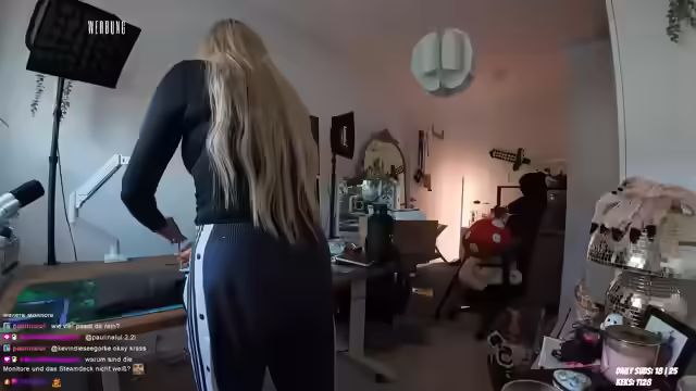 04:12:32Nach anfänglichen Schwierigkeiten gelingt es der Streamerin, den Monitorarm zu befestigen und die Neigung einzustellen. Sie ist begeistert, wie gut die neue Halterung in Kombination mit dem Monitor aussieht, insbesondere von hinten. Sie erklärt, dass sie bewusst eine weiße Halterung gewählt hat, um zum Design ihres Monitors zu passen. Während der Anpassungen muss sie ihren Teleprompter vorübergehend zur Seite legen, den sie für Skripte und nicht für den Chat verwendet. Die Streamerin versucht, die Monitorhalterung optimal einzustellen, um die gewünschte Position zu erreichen. Sie experimentiert mit verschiedenen Einstellungen und freut sich über das ästhetische Ergebnis, das ihr mehr Platz auf dem Schreibtisch verschafft. Sie muss jedoch noch die genaue Höhe und Ausrichtung der Monitore feinjustieren, was sich als herausfordernd erweist.