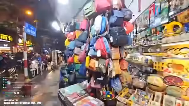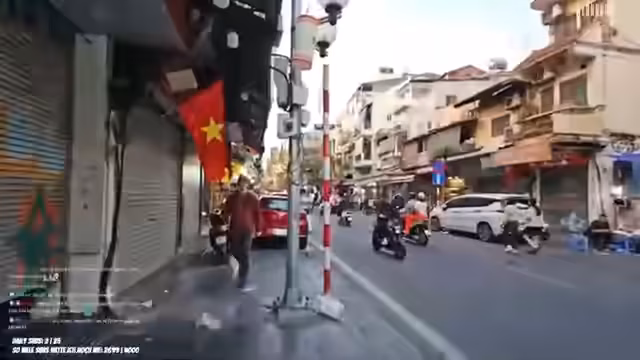 01:53:07Die Streamerin filmt mit ihrer Rückkamera und erkundet eine belebte Straße in Vietnam. Sie äußert ihre Angst vor dem intensiven Verkehr und bemerkt, wie sich der Night Market langsam aufbaut. Die Kamera wackelt stark, was ihre Unruhe in dem überfüllten Umfeld unterstreicht und die hektische Atmosphäre der Umgebung einfängt.