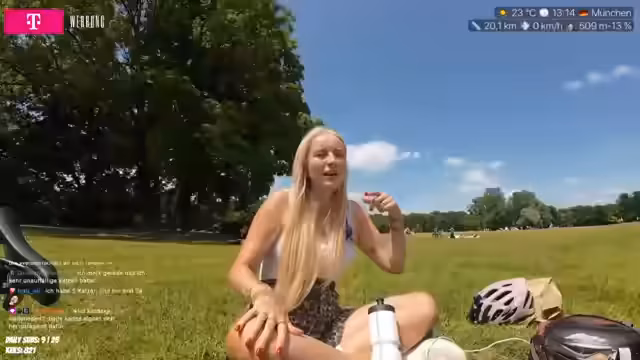 00:20:36Die Streamer fährt mit dem Fahrrad zum Erdbeerfeld in der Nähe des Englischen Gartens. Sie beschreibt die Route und die Landschaft während der Fahrt. Dabei diskutiert sie über verschiedene Perspektiven, die sie mit der Kamera zeigen kann, und die Vor- und Nachteile jeder Position. Die Streamer erwähnt auch die herrliche Aussicht und das gute Wetter, das ihre Freude an der Fahrt steigert. Sie stoppt gelegentlich, um ihre Haare zu frisieren oder die Kamera neu auszurichten.