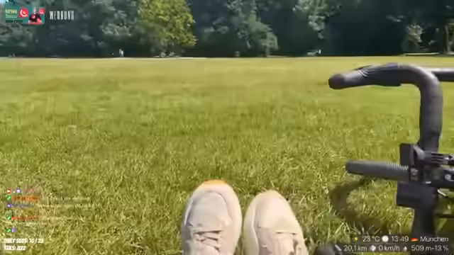 02:57:34Während der Fahrt mit dem Fahrrad zum Englischen Garten bemerkt der Streamer Probleme mit seinem Router, der möglicherweise überhitzt ist. Er erwähnt auch laute Frösche in der Natur. Beim Erreichen des Englischen Gardens zeigt er Begeisterung für die Umgebung und erwähnt, dass er viel zu sehr in dem Park ist. Er plant, dort mit Zuschauern Erdbeeren zu essen und das Fahrrad einzustellen.