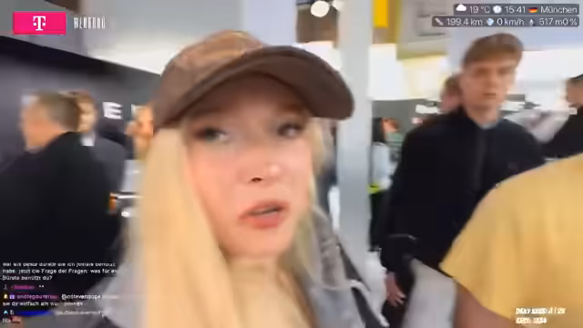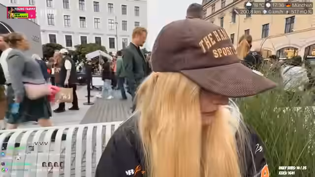 01:36:13Aufgrund des Regens wird eine Shopping-Pause eingelegt. Die Streamer kauft in einem Geschäft eine Cap und eine Mini-Bürste, um ihr Make-up und die Haare zu retten. Sie nutzt die Zeit, um sich neu zu ordnen. Anschließend plant sie, ihre Route zum Marienplatz fortzusetzen. Die IAA ist über verschiedene Plätze in der Münchner Innenstadt verteilt.