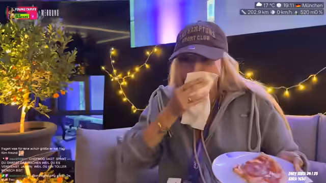 01:50:36Die Streamer blickt auf den bisherigen Tag zurück und erwähnt, dass sie viel Zeit für das Styling ihrer Haare verloren hat, weil der Regen alles ruiniert hat. Sie erklärt, dass ihre Katze 'Sky' nachts ins Schlafzimmer möchte, was ihren Schlaf stört und sie aktuell nicht schlafen lässt. Der Stream endet mit dem Hinweis, sie müsse sich nun wieder auf den Weg machen.
