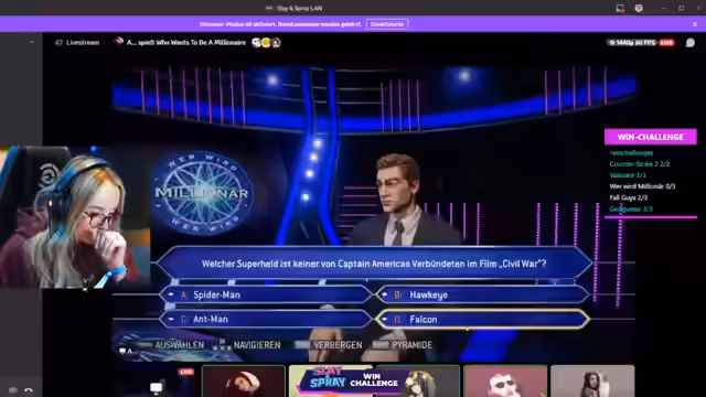 10:49:46Der Fokus verlagert sich auf ein populärkulturbezogenes Quiz. Teilnehmer diskutiert über Charaktere aus Filmen wie *Onward*, der Frage nach dem Hauptcharakter des *Batman & Robin*-Universums und später ausführlich über den Film *Civil War*. Bei dieser Superheldenfrage kommt es zu einer intensiven Diskussion über die Zugehörigkeit der Charaktere zum Marvel-Universum, wobei Spider-Man fälschlicherweise oft als DC-Held identifiziert wird, und eine risikoreiche Antwort, die zum Gewinn führt.
