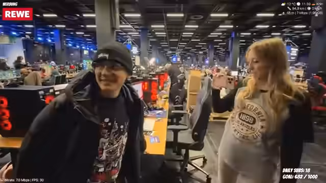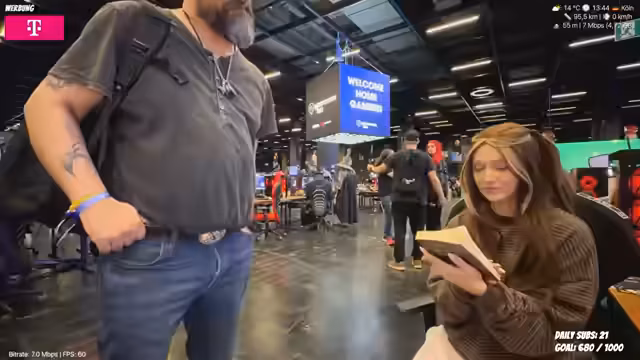 05:14:54Nachdem die technischen Aspekte geklärt sind, begibt sich der Streamer mit Annika auf die Erkundung des Messegeländes. Sie bestaunen die aufwendigen Messestände, wie einen DJ-Pult, und suchen nach Getränken, insbesondere Wasser, was sich als schwierig erweist. Das Gespräch dreht sich um interessante Messestände, geplante gemeinsame Aktivitäten und die allgemeine Stimmung auf der Gamescom.