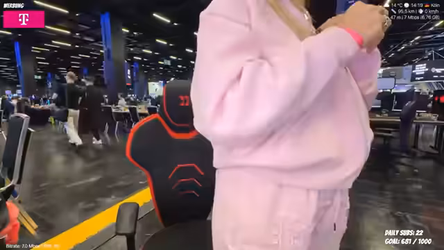 03:39:09Die Streamerin berichtet von ihrer langen Anreise zur Gamescom, die offiziell vier Stunden, aber in der Realität fast fünfeinhalb Stunden gedauert hat. Sie beschreibt ihre Spontanität vor Ort, da sie sich nicht perfekt vorbereitet fühlt. Ein Stuhl dient ihr als temporäres Arbeitsgerät, und sie erwähnt, dass sie planlos durch die Halle läuft, um die Atmosphäre zu genießen und mit dem Chat zu interagieren, anstatt nur zu zocken.