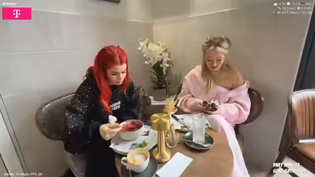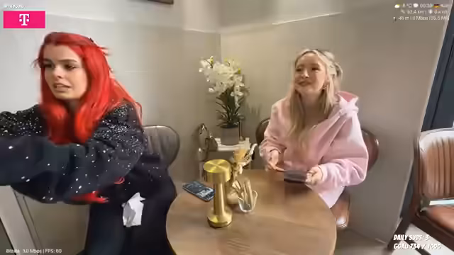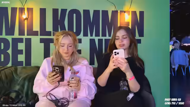 02:04:14Im 'The Nest' wird aktiv mit anderen Streamern und Sponsoren interagiert. Die Streamerin spricht mit bekannten Creator-Namen, wie Jasmin, und verteilt Produkte von Sponsoren wie Aoste und Red Bull. Sie probiert neue Produkte aus und nimmt Goodies mit. Es finden kurze Gespräche mit anderen Persönlichkeiten der Szene statt, was die gute Vernetzung zeigt.