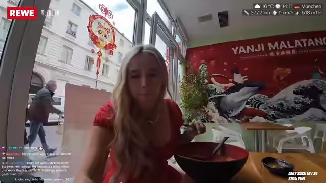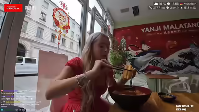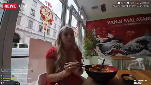 04:13:28Die Streamerin spricht über ihre mögliche Teilnahme an der TwitchCon, bevorzugt aber eine andere Location als Rotterdam. Sie genießt ihr Malatang und erwähnt, dass sie dafür 14 Euro bezahlt hat. Es wird über den Geschmack der Brühe und die verschiedenen Zutaten gesprochen, die den Geschmack annehmen. Sie erwähnt, dass es in München mehrere Malatang-Restaurants gibt und sie dieses hier bevorzugt, da es zentral liegt. Früher habe sie sich nicht getraut, im Stream Englisch zu reden, aber mittlerweile mache sie das öfter, auch weil viele ihrer Kollegen kein Deutsch sprechen. Sie betont, dass es in Deutschland oft eine Scham gibt, Englisch mit Akzent zu sprechen, während viele Leute im Ausland es cool finden, wenn man sich in einer Fremdsprache verständigen kann. Sie erzählt von ihrem Vorstellungsgespräch auf Englisch bei Hollister und bedankt sich für die Follows. Ein Raid von AlaSarah wird begrüßt und es wird über den aktuellen Aufenthalt von Karni in Madrid gesprochen. Abschließend werden League-Spieler erwähnt, die oft unterwegs sind, um auf anderen Servern zu zocken.