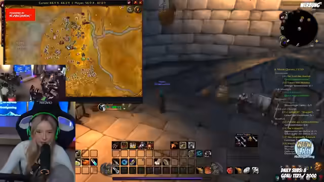 05:45:12Der Streamer nutzt ein Gilden-Map-Add-on, um über den Zustand der Gildenmitglieder informiert zu werden, und erhält eine Warnung, wenn jemand wenig Leben hat. Er äußert seinen Frust über die geringe Spawn-Rate von Monstern und die Notwendigkeit, bestimmte Gegenstände wie 'Mondpirscher-Pelze' zu farmen. Gleichzeitig diskutiert er die Mechanik des 'Rested XP', das man für nicht Spielen erhält, und wie es das Leveln beeinflusst.