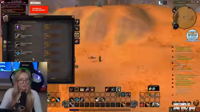 08:43:48Der Fokus liegt auf dem Gameplay in World of Warcraft. Der Streamer spricht über Quests, den Verkauf von Gegenständen und die Stufenaufhebung. Er erwähnt spezielle Fähigkeiten, das Erlangen von Finanzen und seine aktuellen Aktivitäten in der Spielwelt, während er mit dem Chat interagiert und Fragen zu Questlog und Gegenständen klärt.