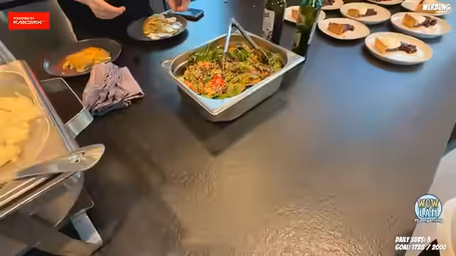 02:47:50Der Streamer und seine Begleiter sind auf der LAN Party und erkunden das Angebot. Sie stellen sich an einen Stehtisch und genießen das Essen. Der Streamer probiert verschiedene Gerichte wie Risotto, Burger und Blaubeerkuchen und zeigt sich begeistert. Er teilt mit, dass er sich in einer sportlichen Phase befindet und daher gesunde Optionen bevorzugt. Er interagiert mit Chat und anderen Anwesenden, zeigt sein Setup und äußert sich positiv über die Veranstaltung.