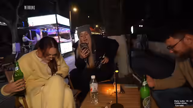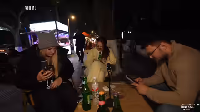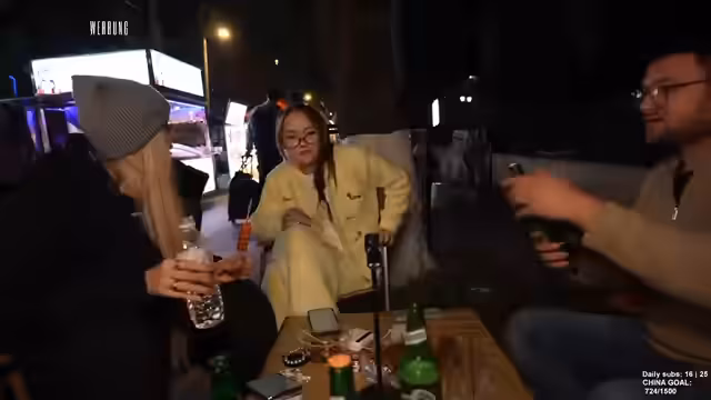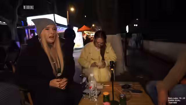 04:11:08Die Streamer müssen ein Didi (ähnlich wie Uber) buchen, da einer von ihnen seinen nicht bezahlen kann. Sie diskutieren, ob sie direkt zum Hotel oder zur Bar fahren sollen, entscheiden sich aber, zuerst ins Hotel zu gehen, um sich wärmere Kleidung zu holen, da es sehr kalt geworden ist. Die Streamerin friert stark und bereut, ihre Jacke vergessen zu haben. Sie überlegen, ob sie die Zuschauer mit ins Hotel nehmen sollen, um den Weg zu dokumentieren. Die Kälte wird als intensiver empfunden als an den Vortagen, was die Dringlichkeit, sich warm anzuziehen, erhöht.