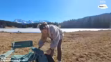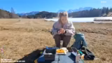 04:03:16Nach dem Kochen wird eine kurze Erkundung der Umgebung unternommen. Der Streamer bewegt sich entlang eines Sees und zeigt die beeindruckende Bergkulisse im Hintergrund. Dabei macht er auf besondere Geländemerkmale aufmerksam, wie zum Beispiel einen kleinen Bachlauf und eine alpine Vegetation. Er gibt einen pädagogischen Hinweis, dass die dunklen Flecken auf dem See dünnes Eis markieren und ein Betreten extrem gefährlich wäre, und äußert die Absicht, die Gegend im Sommer zu besuchen, wenn es wärmer ist.