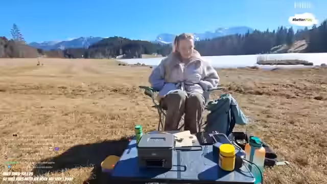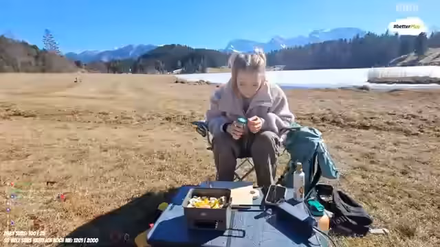 01:35:48Nachdem das Parken gelöst ist, wird die Ausrüstung für das Outdoor-Kochen aus dem Auto geholt. Streamer rüstet den Tisch und die Kochausrüstung, darunter ein Essbit-Kocher, aus. Die Umgebung wird als idyllisch und ruhig beschrieben. Im Hintergrund ist die Zugspitze zu sehen. Während des Aufbaus werden Ziegen im Hintergrund gehört und eine Frau, die barfuß und ohne Hose über das Feld geht, was als lustig kommentiert wird.
