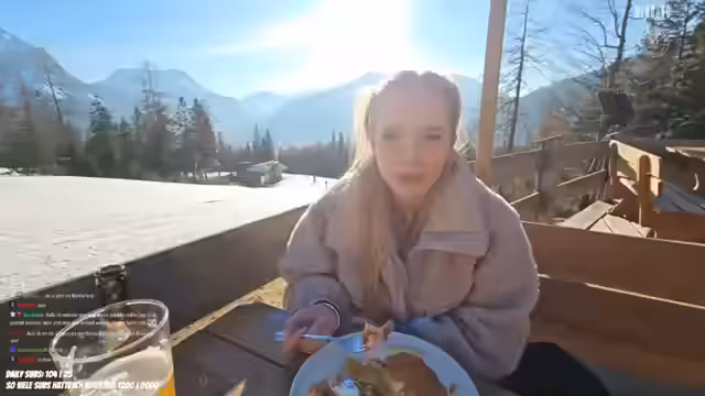 07:21:17Nach dem beschwerlichen Aufstieg erreicht der Streamer schließlich die Alm in 1200 Metern Höhe. Dort setzt er sich auf die Terrasse und beginnt, ein Gericht zu zubereiten. Bestellt und zubereitet wird ein Kaiserschmarrn, der auch von den Chatern als genussvoll wahrgenommen wird. Das Ziel des Streams, das Outdoor-Kochen, wird somit erreicht.