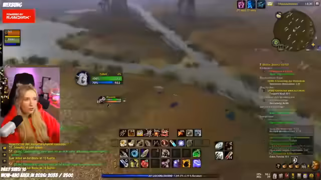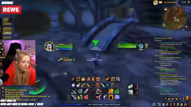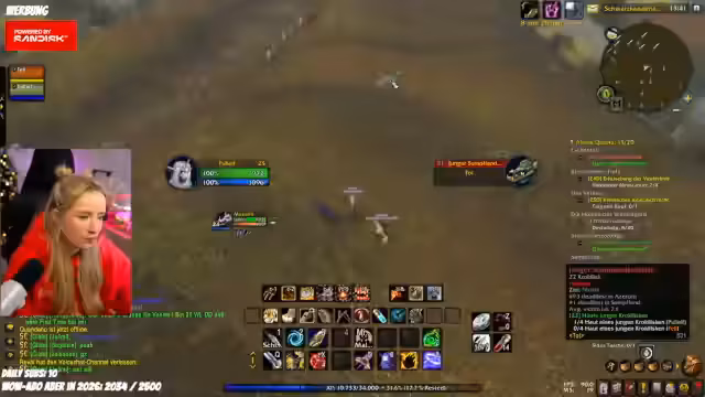 04:19:02Beim Questen im Sumpfland mit Feli stellt die Streamerin fest, dass sie eine wichtige Quest nicht annehmen kann, da sie eine vorhergehende Quest nicht vollständig abgeschlossen hat. Sie hilft Feli, ihre Questlog zu überblicken, und strategisiert, wie sie gemeinsam die Gegner, wie Krokodile, effizient angreifen können. Dabei nutzt sie ihre Fähigkeiten, um Aggro zu kontrollieren und Feli zu schützen, was das Teamwork im Spiel unterstreicht.