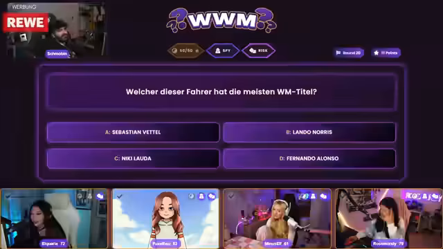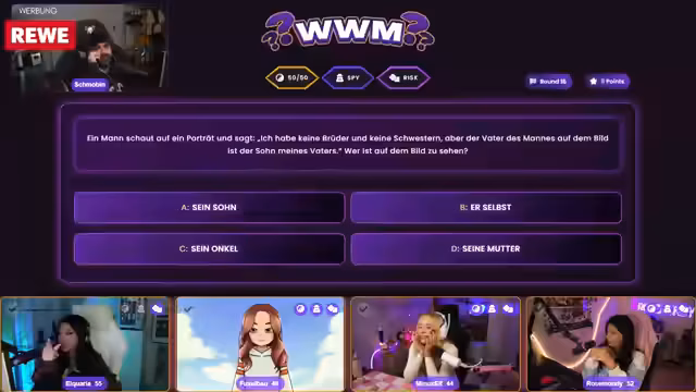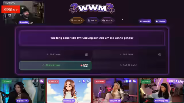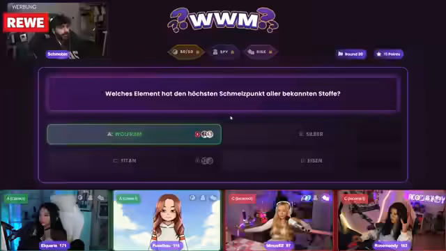 05:54:56Die Streamerin und die Teilnehmer, darunter Fuchsel, Aquarius und Rosemondi, bereiten sich auf ein Wissensquiz vor. Es wird betont, dass es nicht schlimm ist, wenn man nicht alles weiß, und dass Intelligenz nicht davon abhängt, ob man alle Fragen beantworten kann. Das Quiz besteht aus 30 Fragen im Stil von 'Wer wird Millionär', wobei die Fragen zunehmend schwieriger werden und die Punkte pro Frage steigen. Jeder Teilnehmer hat drei Joker: einen 50-50 Joker, einen Spy Joker, um die Antworten der anderen zu sehen, und einen Risk Joker für doppelte Punkte bei richtiger Antwort oder Punktabzug bei falscher Antwort. Die erste Frage, 'Was unentbehrlich ist, daran gibt es einer verbreiteten Redensart zufolge nichts zu?', wird von allen korrekt mit 'rütteln' beantwortet. Auch die zweite Frage nach einer Lauch-Kulturart wird richtig mit 'Charlotte' beantwortet.