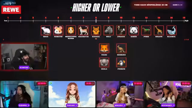 07:05:19Nach erneuten technischen Problemen und dem Wechsel zu einem neuen Link wird ein weiteres Spielformat vorgestellt. Die Teilnehmerinnen müssen Streamerinnen nach der Anzahl ihrer gestreamten Stunden im Jahr 2025 sortieren. Jede Teilnehmerin hat drei Leben und beginnt mit Phoebe, die 1115 Stunden gestreamt hat. Sam platziert sich selbst über Phoebe, was korrekt ist. Fuchsel versucht, Aquaria zu platzieren und begeht den ersten Fehler, was direkt angezeigt wird. Die Runde geht weiter, wobei die Teilnehmerinnen versuchen, die Streamerinnen korrekt in die Reihenfolge zu bringen, basierend auf ihrer Einschätzung der Streaming-Dauer. Die Schwierigkeit liegt darin, die genauen Stunden der einzelnen Streamerinnen zu kennen, was zu weiteren Fehlern führt. Es wird deutlich, dass einige der Teilnehmerinnen ihre eigenen Streaming-Zeiten oder die anderer nicht genau einschätzen können, was das Spiel spannend und unvorhersehbar macht.