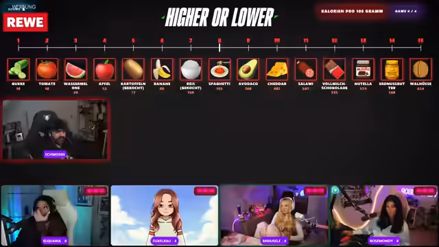 07:45:56Die letzte Spielrunde dreht sich um Kalorien pro 100 Gramm, wobei gekochte Spaghetti mit 155 Kalorien als Referenz dienen. Die Teilnehmerinnen müssen Lebensmittel wie Nutella, Tomate, Erdnussbutter, Gurke, Banane, Avocado, Vollmilchschokolade, Salami, Cheddar, Wassermelone, Walnüsse, Reis, Apfel und Kartoffel in die richtige Reihenfolge bringen. Nutella und Erdnussbutter werden korrekt als kalorienreicher als Spaghetti platziert, während Tomate und Gurke als kalorienärmer eingeordnet werden. Die Einschätzung von Lebensmitteln wie Avocado, Cheddar und Walnüssen führt zu Fehlern und Diskussionen über deren Nährwerte. Besonders die Kartoffel erweist sich als Stolperstein, da ihre Kalorienzahl von den Teilnehmerinnen falsch eingeschätzt wird. Die Runde ist sehr herausfordernd, da das Wissen über die genauen Kalorienwerte der Lebensmittel begrenzt ist. Am Ende der Runde werden die Punkte zusammengezählt, wobei Sam mit 16 Punkten den ersten Platz belegt, gefolgt von Jasmin (12 Punkte), Rose (11 Punkte) und Fuchsel (9 Punkte). Die technischen Probleme mit der Punkteanzeige werden humorvoll zur Kenntnis genommen.