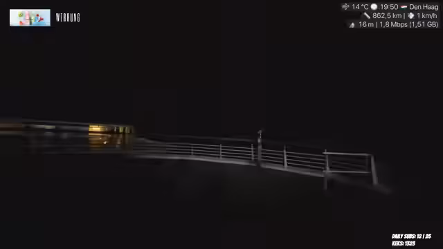 09:15:29Der Streamer begibt sich erneut zum Pier, um die Gegend zu erkunden und das Riesenrad zu sehen. Er bemerkt den starken Wind und die Tatsache, dass wenig Menschen unterwegs sind, was an einen Lockdown erinnert. Die Nordsee wird als „Brecher“ beschrieben, und der Gedanke an Bungee-Jumping über dem Meer wird als „völlig verrückt“ und „geisterkrank“ abgetan, da der Streamer unter Thalassophobie (Angst vor tiefem, offenem Wasser) und Höhenangst leidet. Trotzdem findet er das Riesenrad „so hübsch“ und plant, es am nächsten Tag bei Tageslicht zu besuchen. Die Lichter am Horizont werden als Windmühlen identifiziert, und es wird über die Möglichkeit gesprochen, am nächsten Tag Leute beim Bungee-Jumping zu beobachten, auch wenn der Streamer selbst dies niemals tun würde. Die Vorstellung, in einem U-Boot zu sein, wird als ähnlich schlimm empfunden wie Bungee-Jumping.