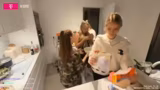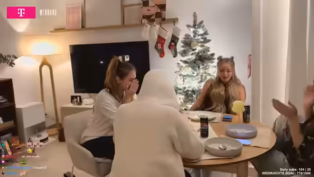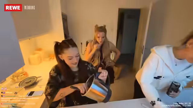 02:01:41Die Erinnerung an die Stream Awards ist ein wiederkehrendes Thema. Die Streamer sprechen über die Aftershow-Party, die sie als ultra lustig beschreiben, und gratulieren sich gegenseitig zu bestandenen Prüfungen wie 'Pünktchen' für ihre Ausbildung. Die Stimmung ist freundschaftlich und euphorisch. Der Übergang zum nächsten Thema ist fließend, da sie vom Feiern zum gemeinsamen Kochen übergehen und die Zubereitung von Plätzchen in Angriff nehmen. Dabei wird bereits der Teig vorbereitet und die Freude über gemeinsame Aktivitäten ist spürbar.