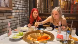 01:07:01Während des Essens tauchen verschiedene Ernährungsthemen auf. Anna erzählt, dass sie aufgrund einer scharfen Suppe in Südkorea geweint hat, und minuself betont ihre Vorliebe für Litchi-Saft. Sie führen ein neckisches Duell darüber, wer beim Essen gewinnen würde, wobei Anna ihre Stärke als Kampfsportlerin betont. Schließlich stellt minuself einen eigenen Erdnuss-Sesam-Dip her und beide tauchen verschiedene Zutaten wie Hähnchen und Tofu in die Brühe.