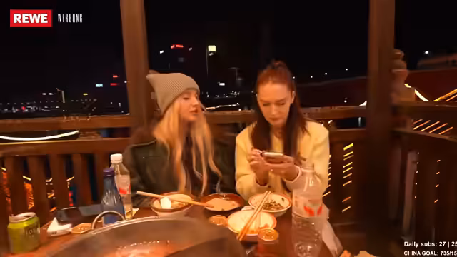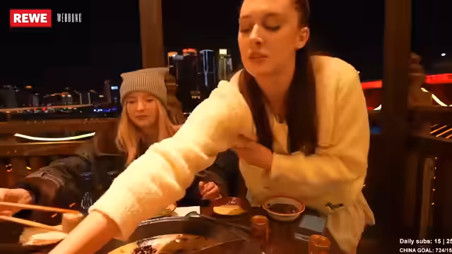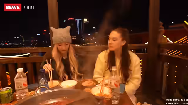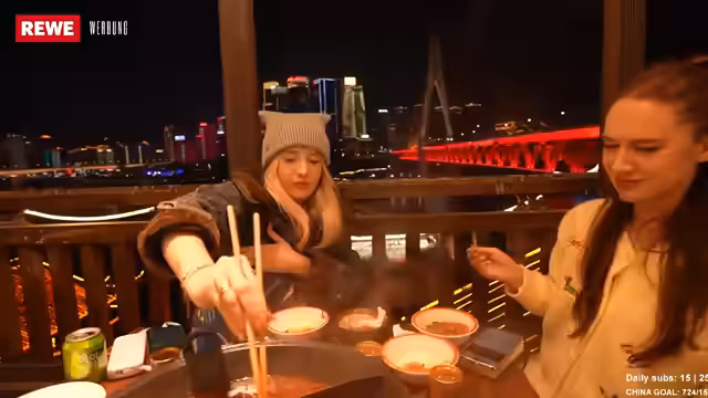 00:21:36Die chinesische Esskultur wird als sehr vielfältig und die Menschen als Liebhaber von Essen, Sauberkeit und schönen Outfits beschrieben. Die Streamerinnen haben bereits einige Street-Food-Spezialitäten probiert, darunter Wantan-Suppe und Dumplings am Morgen. Am Vorabend genossen sie ein authentisches Hotpot-Erlebnis am Ufer mit Blick auf einen Fluss und einen kleinen Wasserfall. Sie sind besonders gespannt auf glasierte Früchte, die sie von TikTok kennen und unbedingt probieren möchten. Die Kommunikation in China ist aufgrund der geringen Englischkenntnisse der Einheimischen eine Herausforderung, die sie mit Sprach-Apps meistern. Trotz der Sprachbarriere erleben sie die Menschen als unglaublich lieb und hilfsbereit. Die Preise für Essen und Unterkünfte sind im Vergleich zu Deutschland deutlich günstiger, was die Reise angenehmer macht.