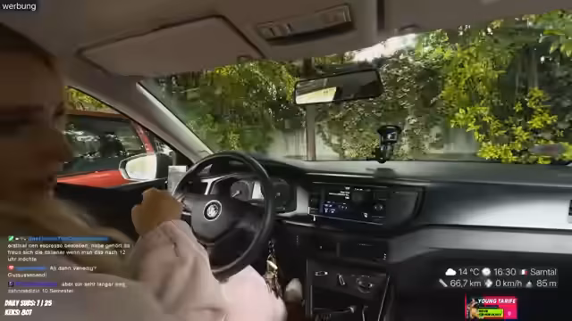 02:16:07Der Streamer berichtet von der aktuellen Burgruine und der Toleranz-Berechnung, wobei er einräumt, dass durch die Sonnenbrille alles cremefarben wirkt. Es wird geplant, für die nächsten drei Tage Gutes zu essen, und der Streamer erwähnt einen Panel-Talk in Hamburg am Sonntag. Ein Problem mit der Action-Cam wird angesprochen, und der Streamer äußert Glücksgefühle. Nach einer kurzen Staugeplänkele an einer Polizeistation wird die Weiterfahrt angetreten. Der Streamer teilt mit, dass er am Katzenrad gehindert wurde und die Ankunftszeit sich nur um eine Minute verzögert hat, wofür er sich freut.