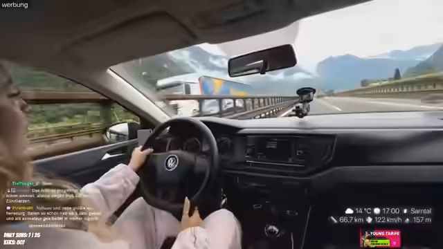 06:22:04Nach mehreren Stunden und kilometerlanger Fahrt, inklusive eines Mautstopps, erreicht der Stream den Gardasee. Die technische Nutzung des Handys zum Streamen überhitzt und ist unkomfortabel. Streamer reflektiert die ereignisreiche Fahrt, in der es Regenschauer, einen beinahe Unfall und eine Navigationspanne gab, und plant, von hier aus nach Verona weiterzufahren.