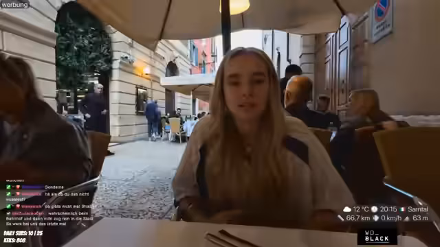 10:41:00Schließlich entscheidet sich die Streamer für das 'Restaurante Nastro' mit exzellenten Bewertungen. Sie geht mit ihrer Kamera im Restaurant essen und ist bemüht, unaufdringlich zu streamen, ohne die anderen Gäste zu stören. Sie stellt sich und ihren Stream vor, erklärt ihre aktuelle Reise durch Italien und gibt bereits einen Ausblick auf die nächsten Tage, die sie nach Sanremo und Venedig führen sollen. Während des Essens hört sie plötzlich lautes Hupen und ist irritiert.