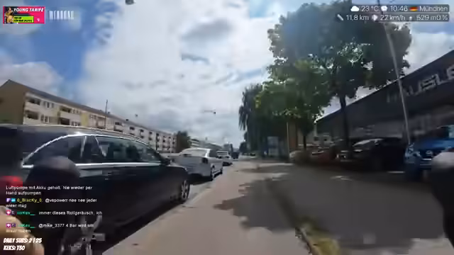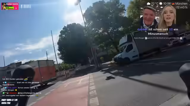 04:40:14Während der Fahrt durch München kritisiert der Streamer aggressive Auto- und Radfahrer, die ihn gefährlich überholen. Er hat mehrere technische Schwierigkeiten: sein Mikro bekommt Tropfen ab, die Kamera wird asynchron und die WLAN-Verbindung bricht vollständig ab, was ihn zwingt, den Stream kurz zu unterbrechen und die App neu zu starten, um weiterfahren zu können.