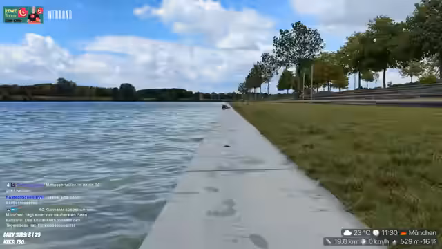 Während einer ausgedehnten Radtour durch München kam es zu mehrfachen Unterbrechungen. Die Verbindungsabbrüche der mobilen Streaming-App führten zu wiederholtem Neustart der Aufzeichnung. Auf dem Weg zu einem künstlich angelegten See, der durch seine Wasserqualität beeindruckte, wurde der Nieselwetterwechsel bemerkt.