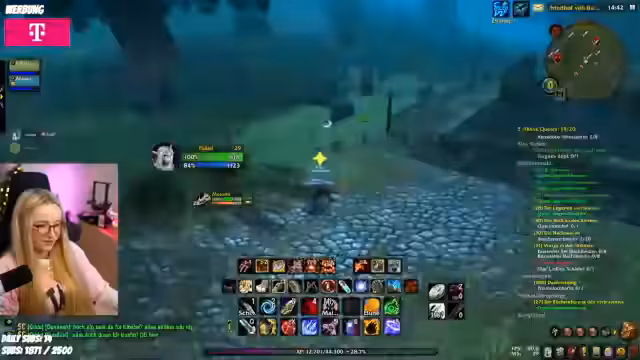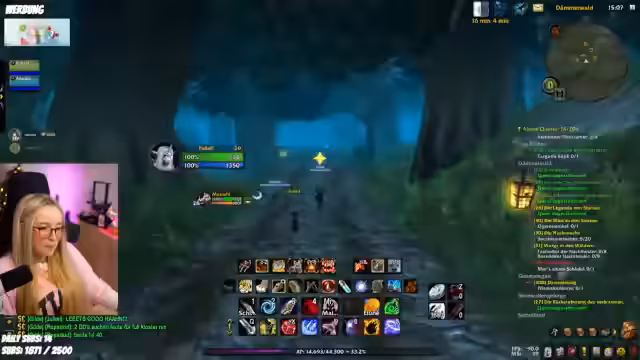 02:18:43Der Streamer spielt mit Annika und anderen zusammen. Es wird eine Strategie fürs Leveln entwickelt: Da es mehr XP gibt, wenn man nicht in einer Gruppe ist, aber trotzdem auf dem gleichen Spielfeld (Layer) ist, planen sie, Quests parallel zu machen. Dies ist besonders bei Sammel-Quests effektiv. Sie müssen aufpassen, den gefährlichen Boss 'Kleiner' im Dämmerwald zu meiden, da dieser einen schnell töten kann.