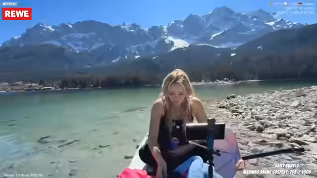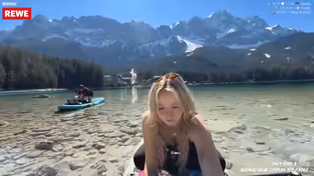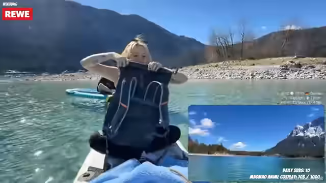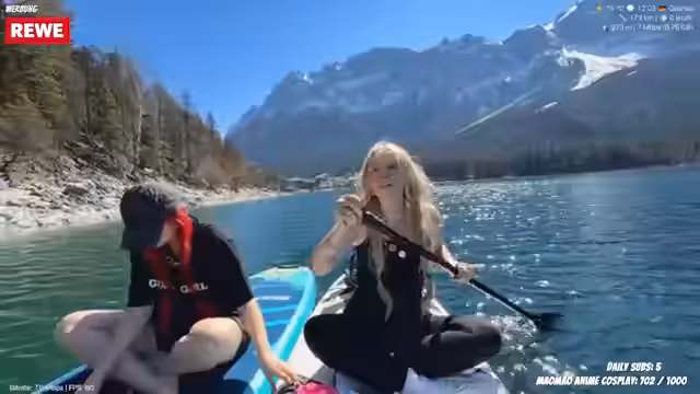 05:29:59Nachdem das Paddelboard festgemacht ist, beginnt die Fahrt auf dem See. Die Streamerin zeigt die beeindruckende Aussicht, darunter die Zugspitze, und beschreibt das Gefühl, auf dem Wasser zu sein. Dabei unterhält sie sich mit Jasmin und dem Chat über verschiedene Themen, von der Angst vor Fischen bis zu geplanten Aktionen wie einem Rennen. Ein besonderes Erlebnis ist der Anblick eines Fischsprungs, ohne dass dabei Bedenken aufkommen. Die Stimmung ist entspannt und sie genießt die Ruhe des Sees.