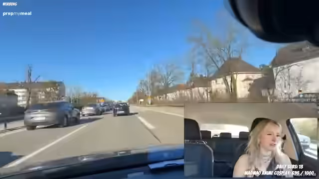 07:23:32Der Streamer leidet gleichzeitig unter Erkältung und Allergie, wobei die Allergie-Symptome wie trockener Husten und Schleimproduktion im Vordergrund stehen. Er trägt eine Auswahl an Gegenständen wie Make-up, Parfüm und Wechselschuhe im Auto bei sich. Die Fahrt geht zu einer Filmpremiere, für die es keinen spezifischen Dresscode gibt. Der Streamer trägt ein sportliches Outfit und ist sich unsicher über die angemessene Kleidung. Es gibt eine gefährliche Situation mit einem nahuffahrenden Motorradfahrer, der sich riskant verhält.