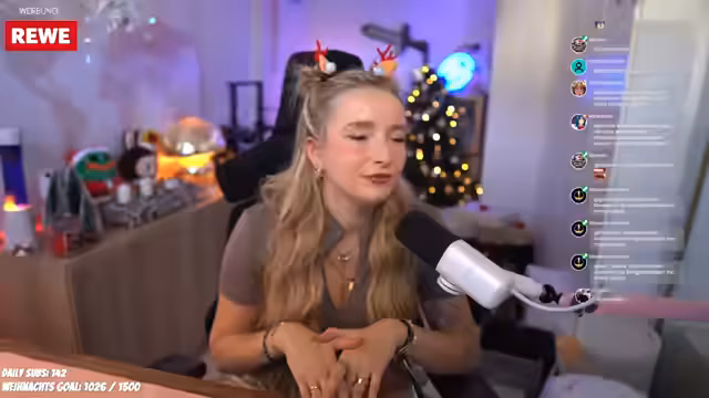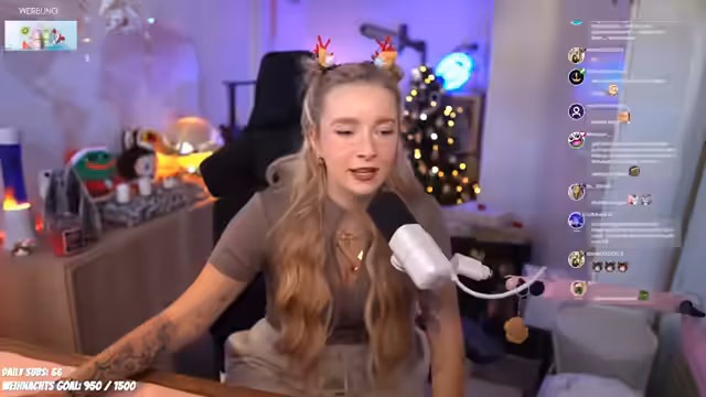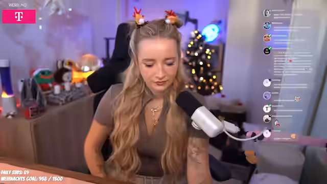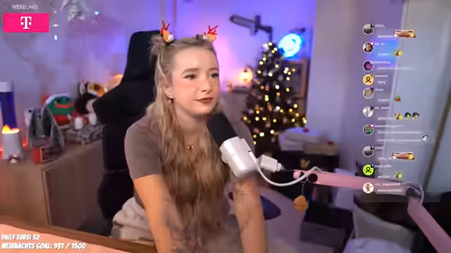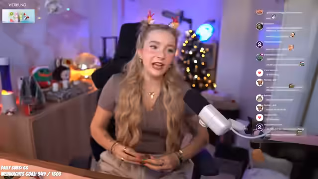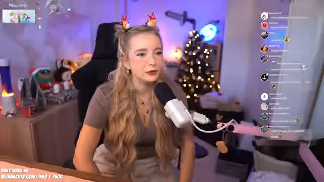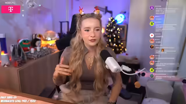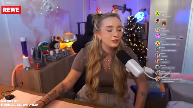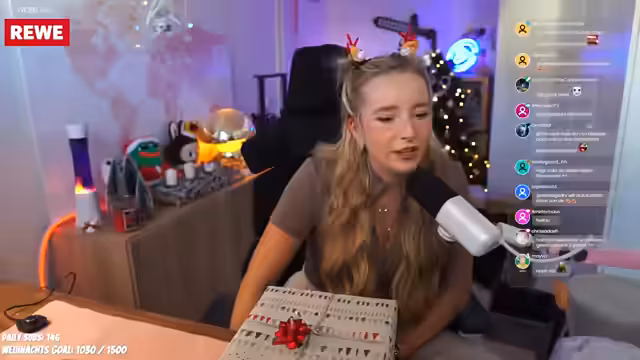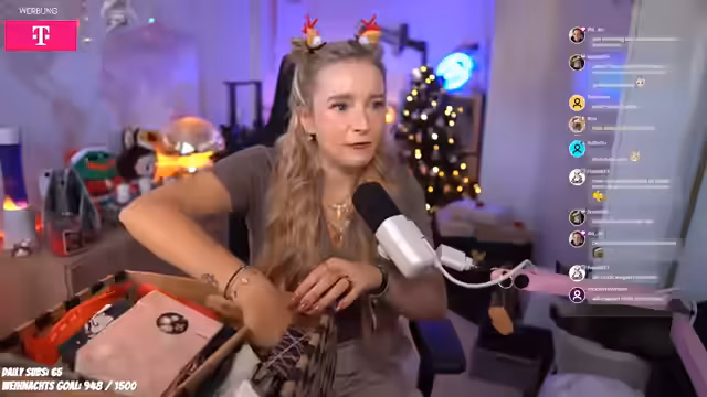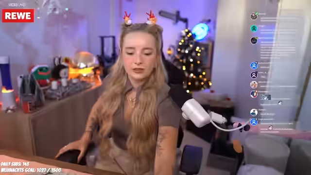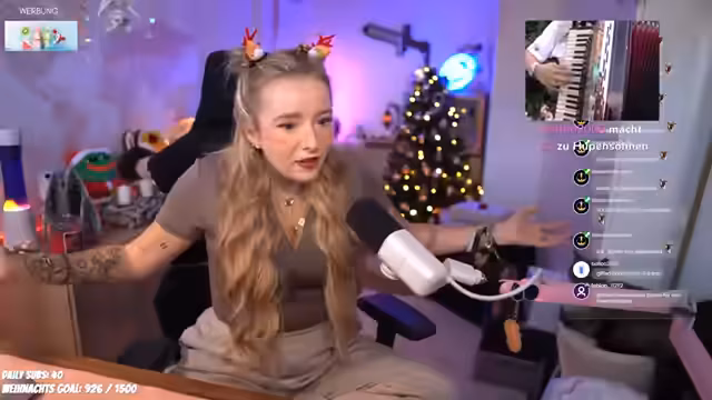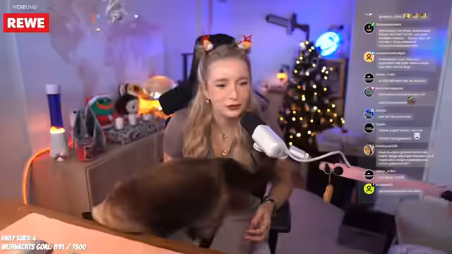 00:09:13Der Livestream beginnt mit dem Ausruf 'Halli, einen wunderschönen' und der Erwähnung des Dienstags. Es wird von einer aufgeregten Katze namens Sky berichtet, die ständig Aufmerksamkeit sucht und den Streamer beim Sitz auf dem Stuhl stört. Angekündigt werden Weihnachtsgeschenke, die jeden Tag verlost und ausgepackt werden, wobei unter anderem eine heiße Fritteuse als Preis genannt wird. Der Weihnachtsbaum im Hintergrund wird gezeigt, wobei die Kameraeinstellung noch nicht optimal ist.