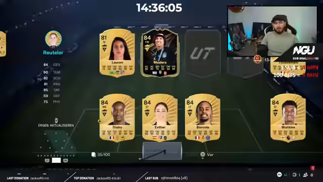 01:36:59Koundé als festes Element im Team zu behalten, ist entscheidend, aber Veränderungen würden die gesamte Chemie zerstören. Der Streamer entscheidet, vorerst beim aktuellen Squad zu bleiben, da umfassende Änderungen zu riskant sind und das Team kaputt machen könnten. Dies zeigt die Vorsicht bei der Aufrechterhaltung des Teams für die kommenden Spiele.