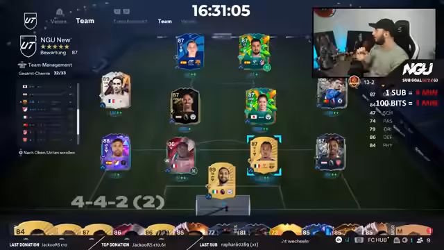 01:32:30Da es sich um einen Road-to-Glory-Account handelt, will der Streamer nicht viel Geld investieren. Er erwägt, Spieler auszutauschen, aber die hohen Preise für certain Karten wie Cola und die Chemie-Probleme machen es kompliziert. Spontane Änderungen werden abgewogen, aber letztlich aufgeschoben, um das Budget zu schonen und das Team nicht zu gefährden.