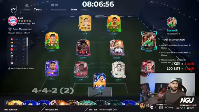07:35:55Der Stream konzentriert sich stark auf die Evolution von Spielern im EAFC. Der Fokus liegt darauf, bestimmte Spieler wie Jaco strategisch zu entwickeln, indem man gezielt auf bestimmte Attribute wie Pace und Ausdauer setzt, anstatt sie sofort zu evolvieren und ihre Meta-Effektivität zu verlieren. Es werden verschiedene Evos wie Raserei Plus und First Touch getestet, um herauszufinden, welche Kombination die Karten am stärksten macht und ihre einzigartigen Stärken wie Quirligkeit und Dribbling hervorhebt.